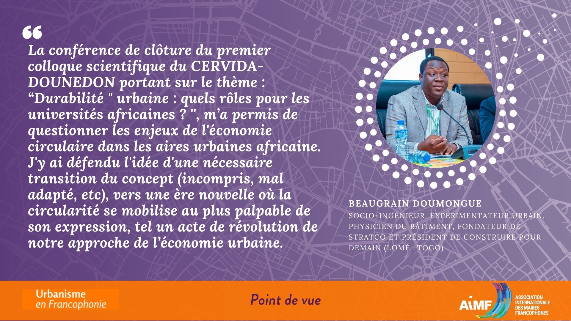 Aux côtés de Edem Adékunlé d’ALMEIDA, Edem koledzi, Joseph Koffi ADJALO et Alphonse SOTOME, Beaugrain Doumongue (Socio-ingénieur, Expérimentateur urbain, physicien du bâtiment, fondateur de StratCo et Président de Construire pour demain (Lomé -Togo)) a questionné les enjeux de l’économie circulaire dans les aires urbaines africaine. Il y a défendu l’idée d’une nécessaire transition du concept (incompris, mal adapté, etc), vers une ère nouvelle où la circularité se mobilise au plus palpable de son expression, tel un acte de révolution de notre approche de l’économie urbaine.