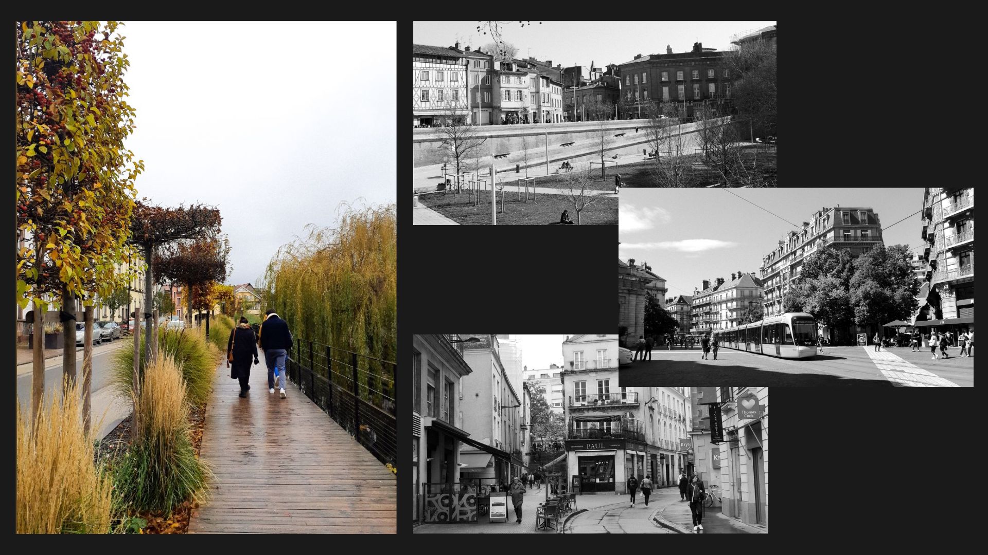 Le paysage et la nature font également partie de la composition urbaine. Cette photo prise dans la ville de Colmar montre une intervention d’aménagement qui valorise le patrimoine naturel local et invite les piétons à flâner et à profiter de son environnement. On ne se rend même pas compte qu’à côté du passage en bois il y a une circulation de véhicules et on sent donc l’harmonie créée dans cet espace urbain paysager.