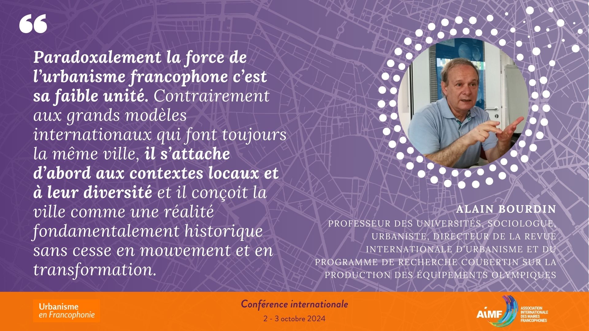Membre du Comité Urbanisme en Francophonie qui travaille au suivi scientifique de la Conférence internationale « Le réenchantement des villes : Urbanisme en Francophonie, horizon 2050 », Alain BOURDIN, est Professeur des universités, sociologue, urbaniste, Directeur de la Revue Internationale d’Urbanisme et du programme de recherche Coubertin sur la production des équipements olympiques.