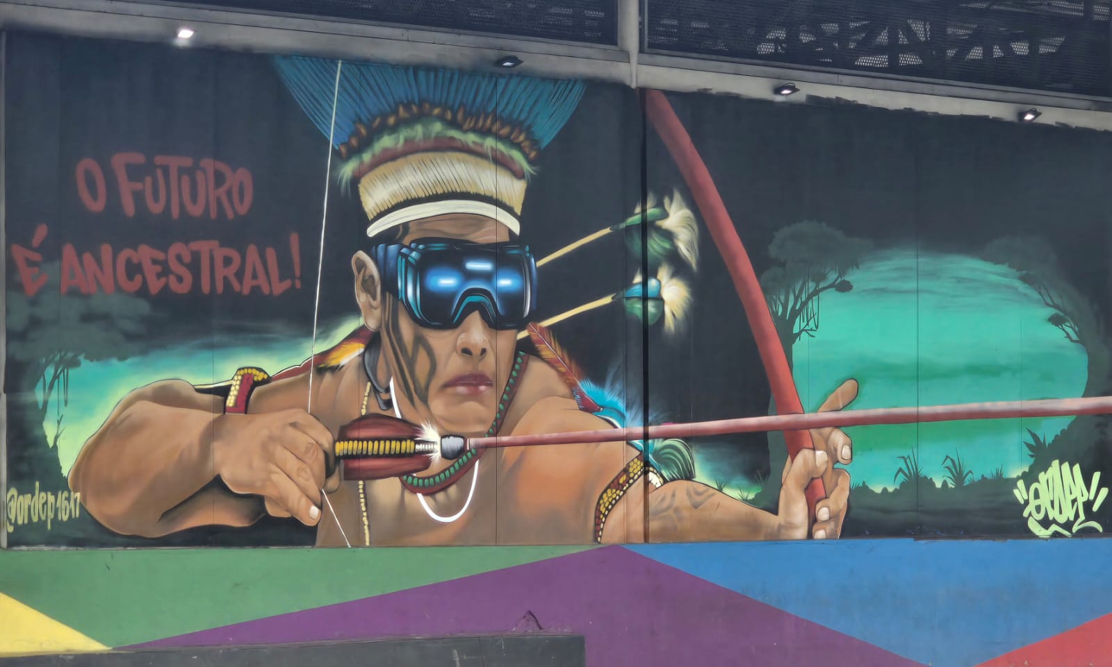 Sur cette fresque, on peut voir un homme (autochtone) portant des lunettes futuristes et tenant un arc et des flèches, donnant l’image d’une vision tournée vers l’avenir. Pourtant, les objets qu’il tient semblent renvoyer à des savoirs anciens, concrets et déjà éprouvés.