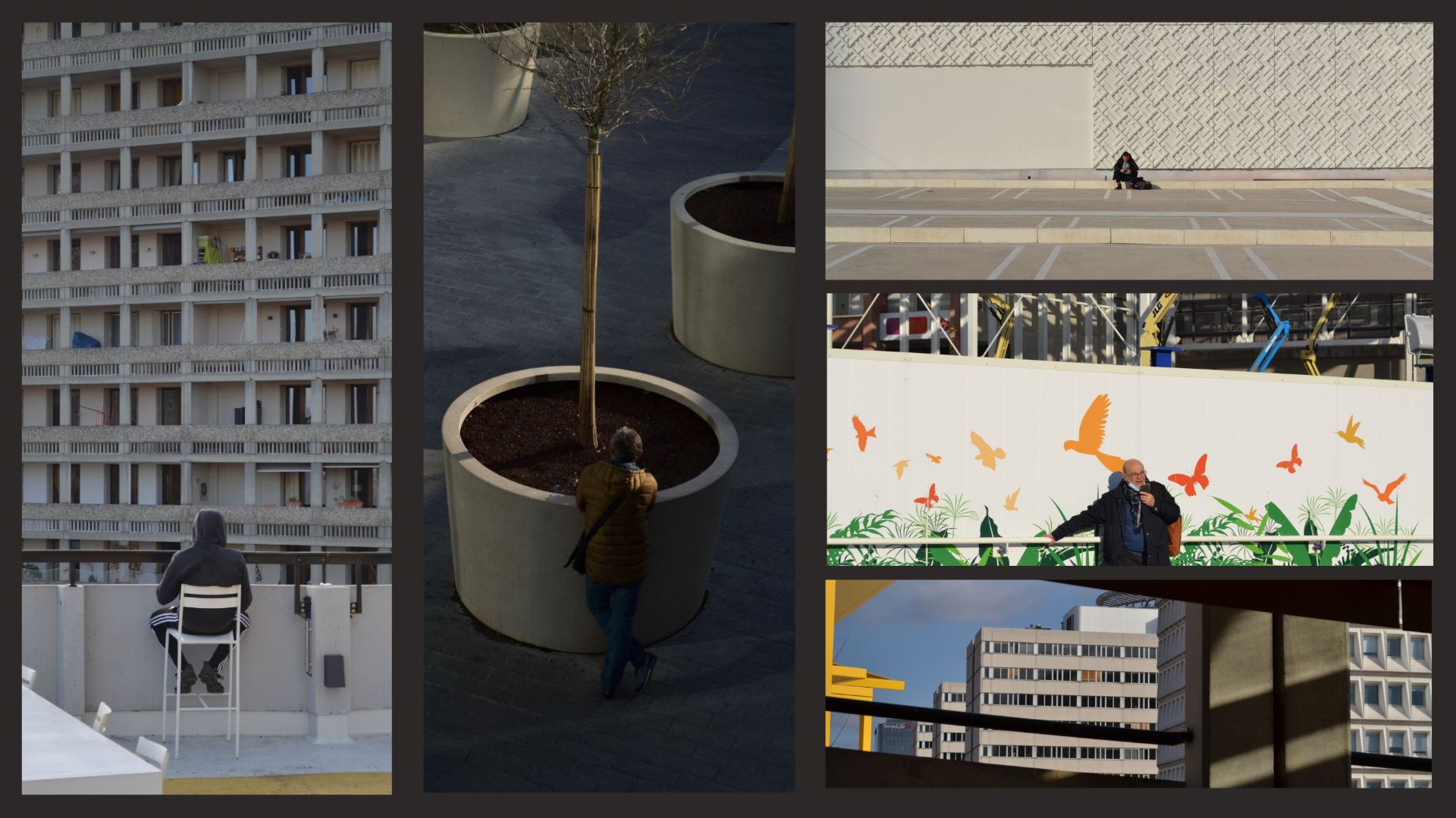 C’est donc un espace urbain multiforme, insaisissable et complètement chimérique, témoin d’un entre-deux, du basculement d’une époque vers une autre. Au centre : les habitants. Les usages sont encore intuitifs, on peut trouver des gens assis à même le bitume, des espaces de détente aménagés en haut d’un parking, des dalles fissurées, vestiges fragiles d’un temps bientôt effacé par la rénovation, mais aussi des nouvelles formes, plus végétalisées, portant une vision plus douce. Les habitants et visiteurs semblent s’approprier ces nouveaux espaces. J’ai donc photographié ces scènes à la fois uniques et intemporelles. Les espaces sont toujours des espaces en devenir aux usages en perpétuelle évolution.