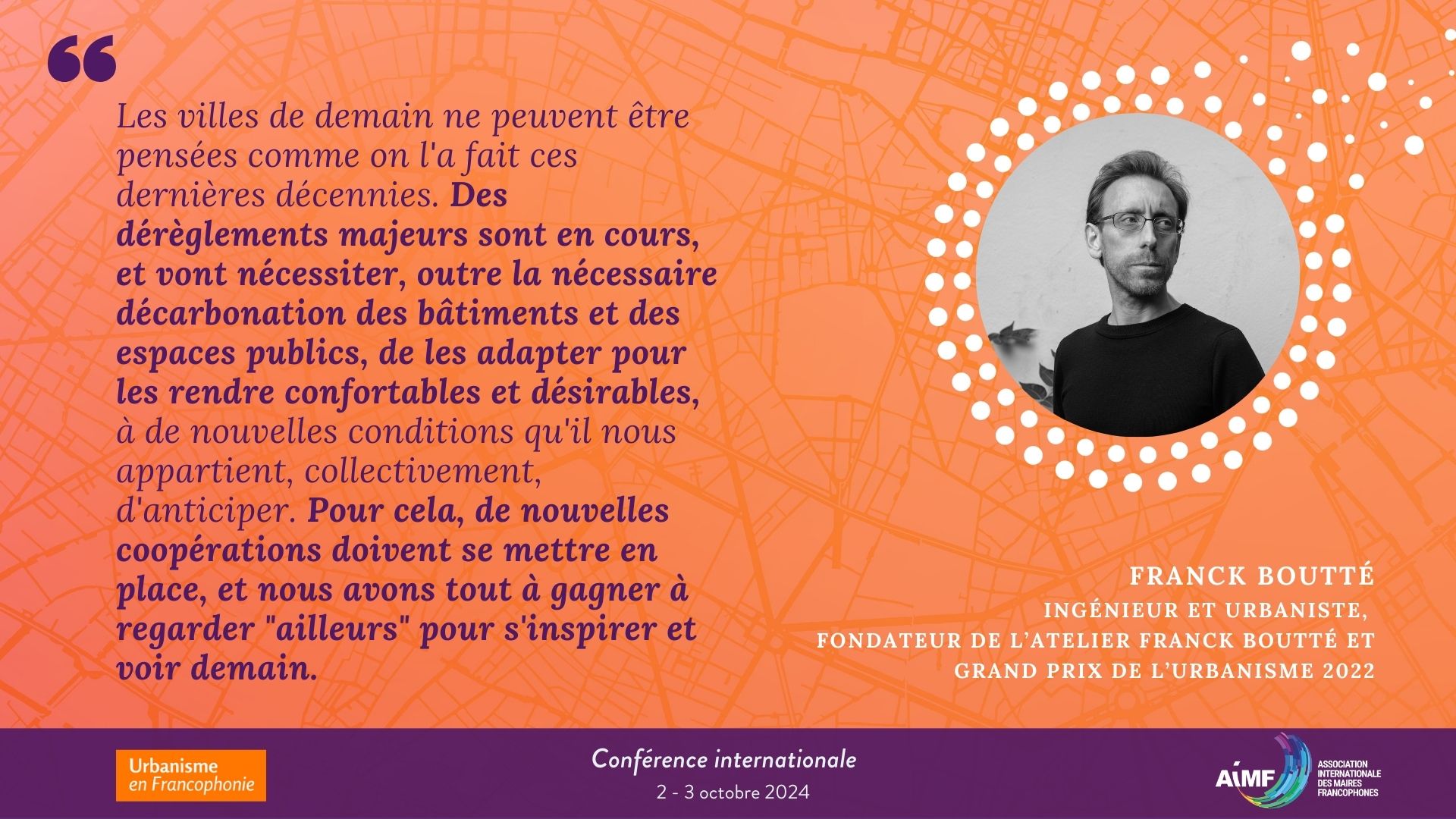 Membre du Comité Urbanisme en Francophonie qui travaille au suivi scientifique de la Conférence internationale « Le réenchantement des villes : Urbanisme en Francophonie, horizon 2050 », Franck BOUTTÉ est Ingénieur formé à l’architecture, Fondateur et Dirigeant de l’atelier Franck Boutté, agence spécialisée sur les enjeux d’environnement, de transition écologique et de soutenabilité, sur des projets à différentes échelles : (bâtiments, quartiers et territoires) en France et à l’étranger (Maroc, Nigéria, Bénin, Sénégal, Côte d’Ivoire…) et Grand Prix de l’Urbanisme 2022.