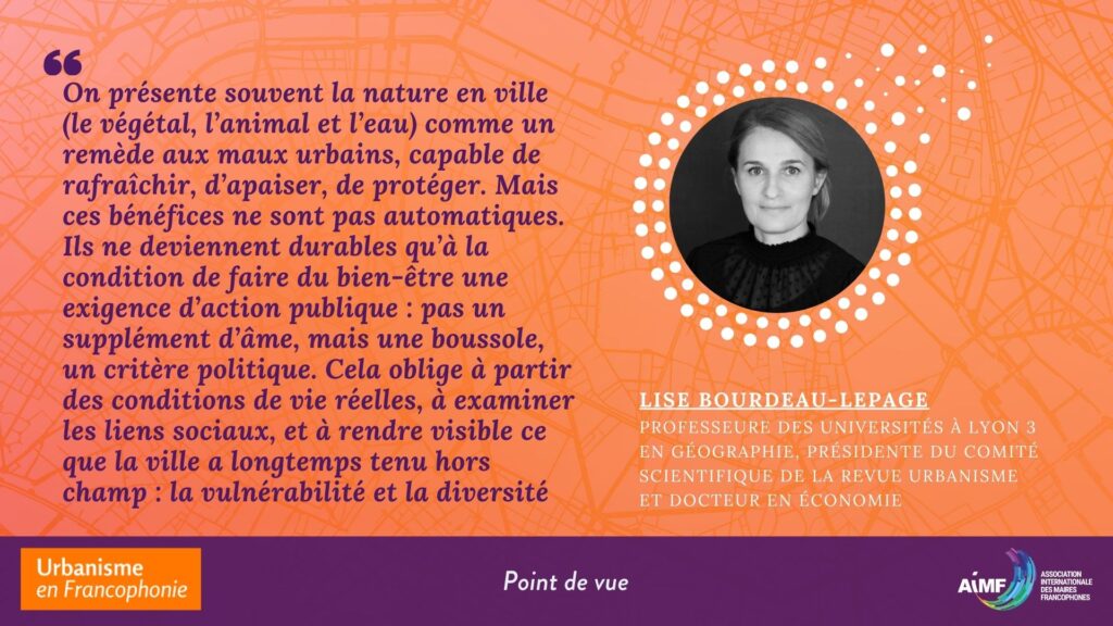 « Peut-on prendre soin de la nature s’il n’y a pas, d’abord, du soin dans la société ? » Pour l’universitaire Lise Bourdeau-Lepage (Professeure des universités à Lyon 3 en Géographie, Présidente du Comité Scientifique de la Revue Urbanisme et Docteur en économie), « mettre le bien-être au centre, ce n’est pas ajouter une couche aux politiques urbaines : c’est changer de perspective ». Dans un article paru le publié le 07 mars 2026 dans Ouest France, elle défend l’idée que prendre soin du vivant exige aussi de prendre soin des relations entre humains.