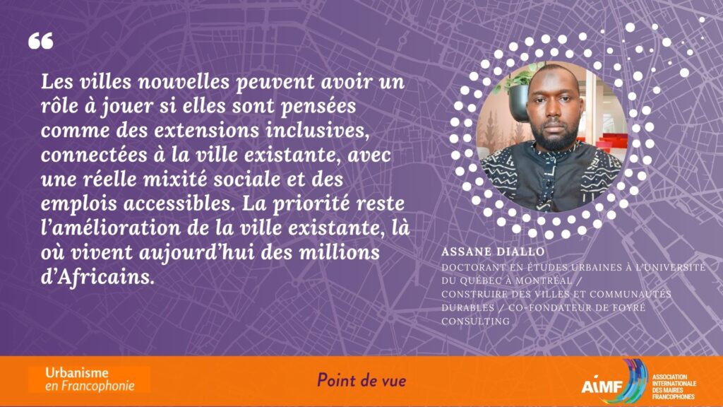 Assane Diallo (Doctorant en Études Urbaines à l’Université du Québec à Montréal (UQÀM) / Construire des villes et communautés durables / Co-fondateur de FOYRÉ Consulting) s’intéresse aux dynamiques territoriales, à la gouvernance urbaine et aux questions de justice socio-spatiale. Il nous explique que depuis plusieurs années, de nombreux pays africains misent sur la création de villes nouvelles pour répondre à la croissance urbaine rapide. L’objectif affiché est clair : désengorger les grandes métropoles, moderniser l’image des villes et attirer les investissements. Mais une question essentielle demeure : répondent-elles réellement aux urgences urbaines ?