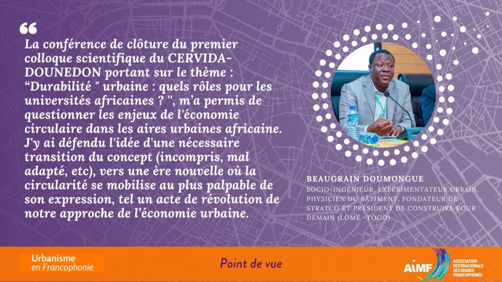 Le 1er colloque scientifique international du CERVIDA-DOUNEDON s’est tenu à Lomé du 18 au 20 novembre 2025, abordant le thème de la durabilité urbaine et le rôle des universités africaines. L’événement visait à explorer les défis et les perspectives du développement urbain durable en Afrique, en favorisant des approches pluridisciplinaires et en partageant des bonnes pratiques. Beaugrain Doumongue a questionné les enjeux de l’économie circulaire dans les aires urbaines africaine.