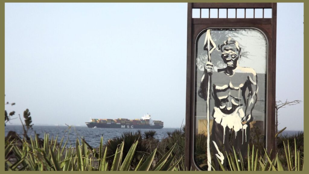 « C’est cette carte postale que je voudrais envoyée parce que cette œuvre fait appel au voyage, à l’histoire, mais elle fait aussi appel aux échanges culturels. Donc, j’ai ce souvenir, quand je vois ce guerrier bantu sur cette fenêtre posée sur l’Île de Gorée, de ces enfants qui racontent l’histoire de leur île et date par date l’histoire de l’esclavage ». Kouka Ntadi, artiste franco-congolais.