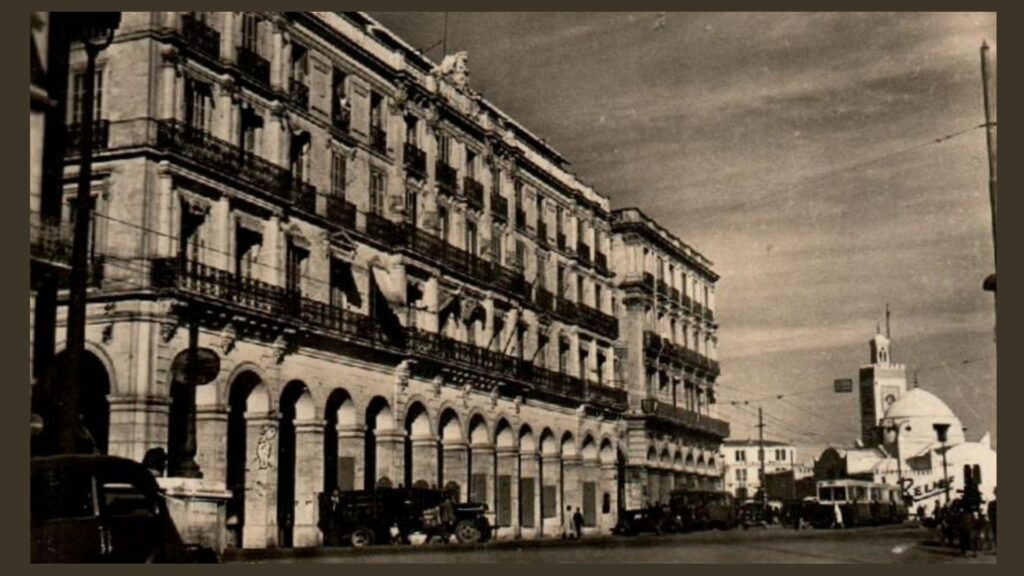 Cette carte postale d’archives, présente l’ancien Mairie d’Alger, auparavant située Boulevard de la République. Le « front de mer » restera dans bien des mémoires comme un superbe balcon face au Levant, la mer et au permanent spectacle du port. L’ensemble de plus de 1500 mètres donnait une façade magistrale à la ville d’Alger.